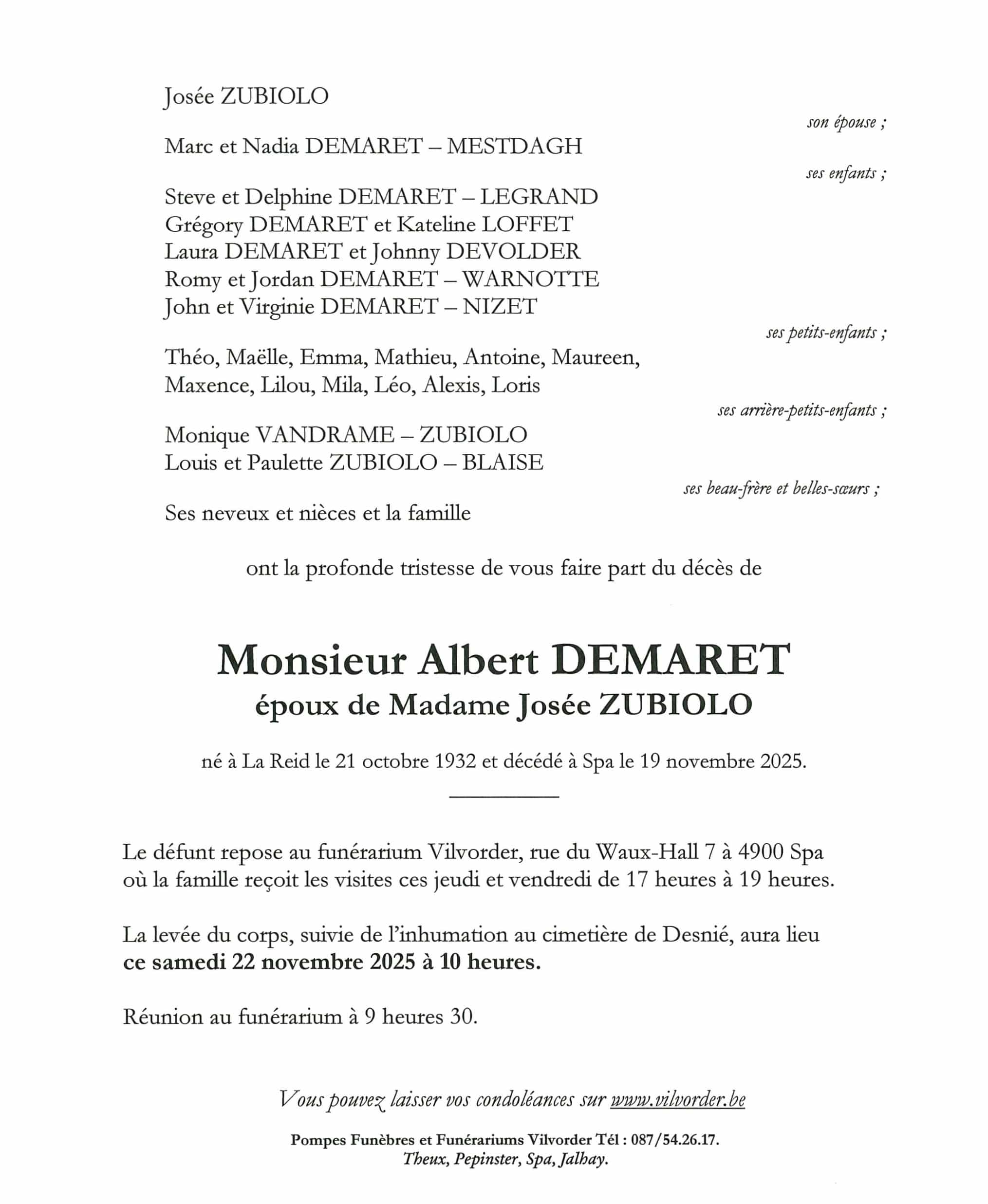 Domicilié(e) à Spa Né(e) le 21/10/1932 à La Reid Décédé(e) le 19/11/2025 à Spa