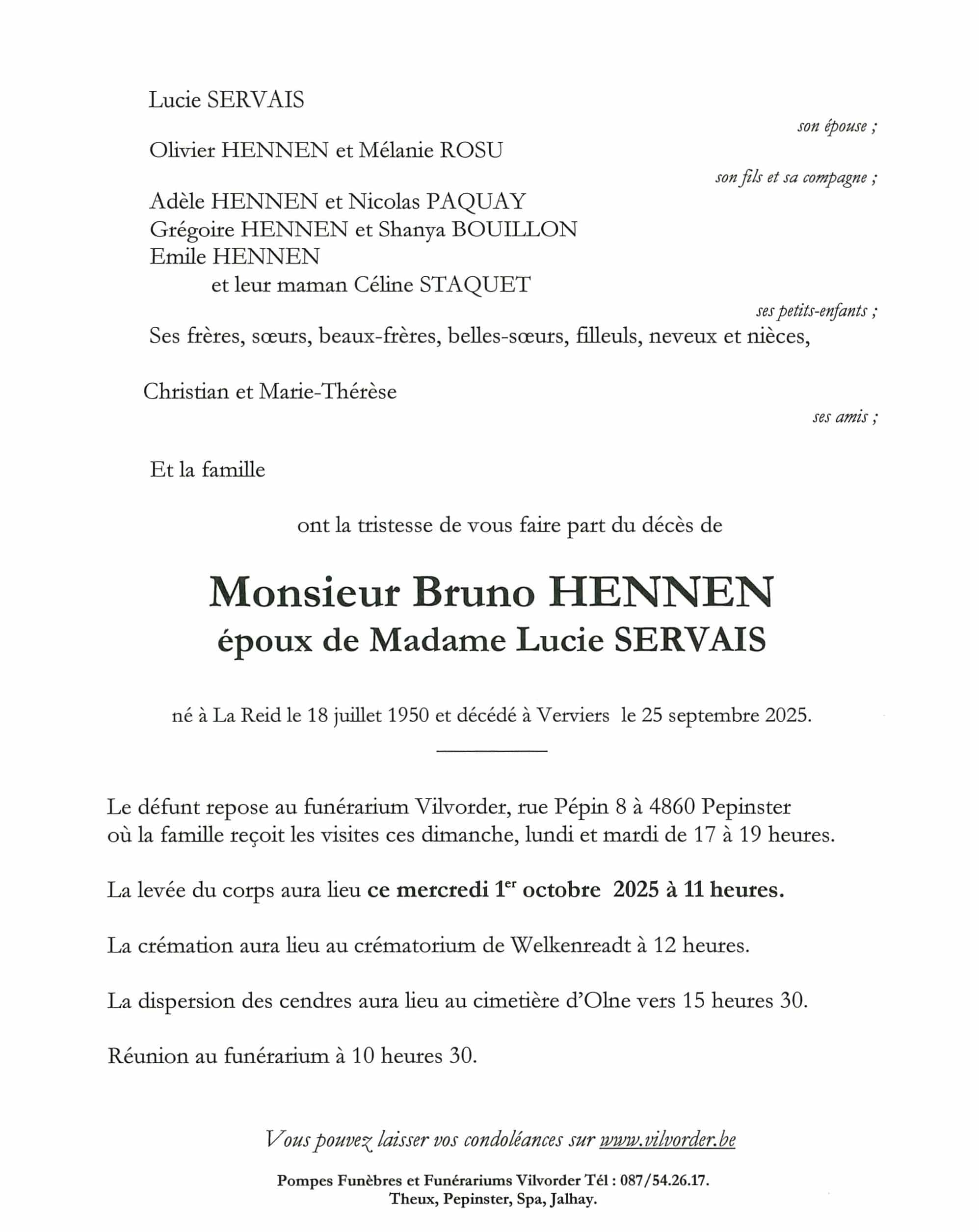 Domicilié(e) à Olne Né(e) le 18/07/1950 à La Reid Décédé(e) le 25/09/2025 à Verviers