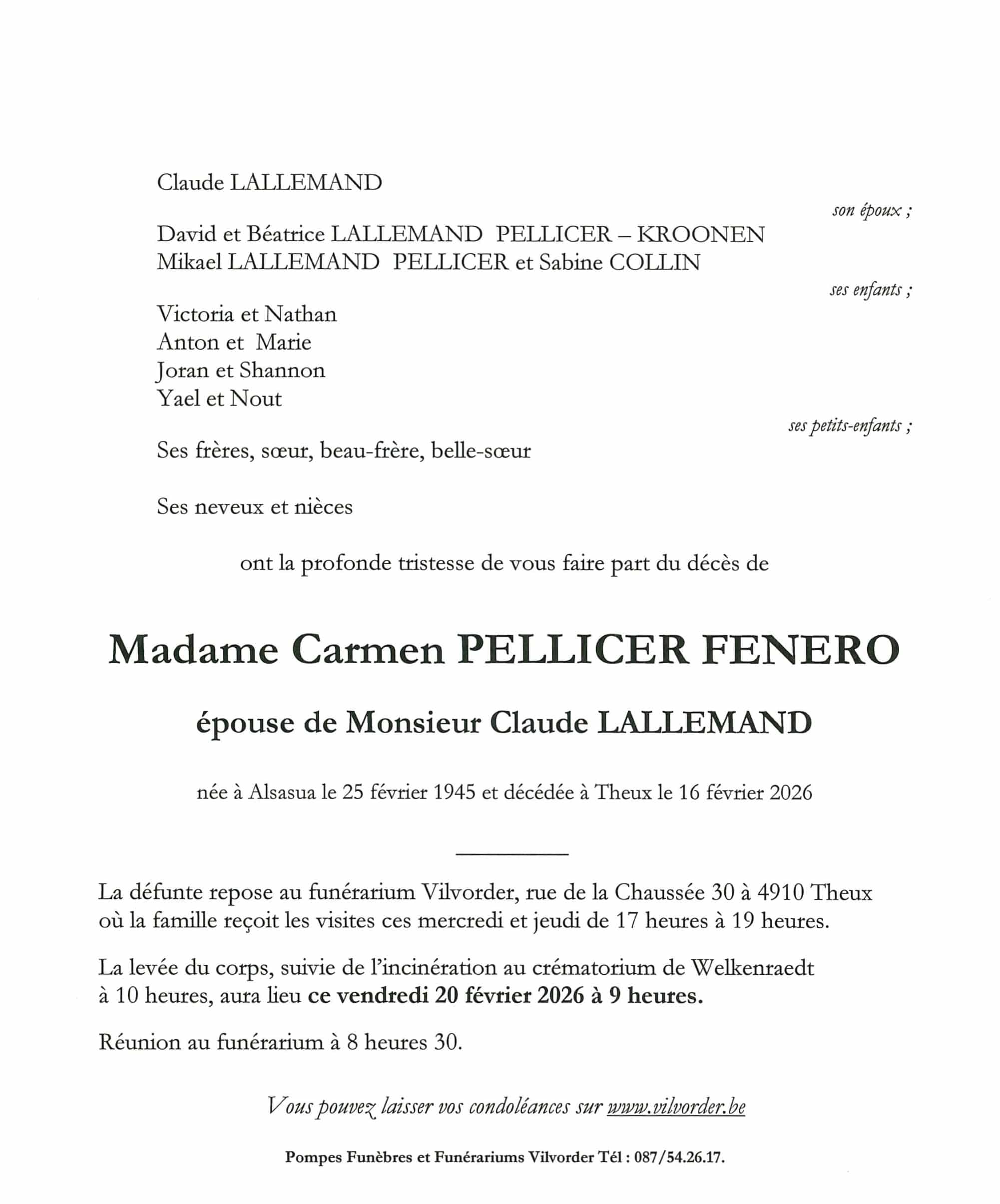 Domicilié(e) à Theux Né(e) le 25/02/1945 à Alsasua Décédé(e) le 16/02/2026 à Theux