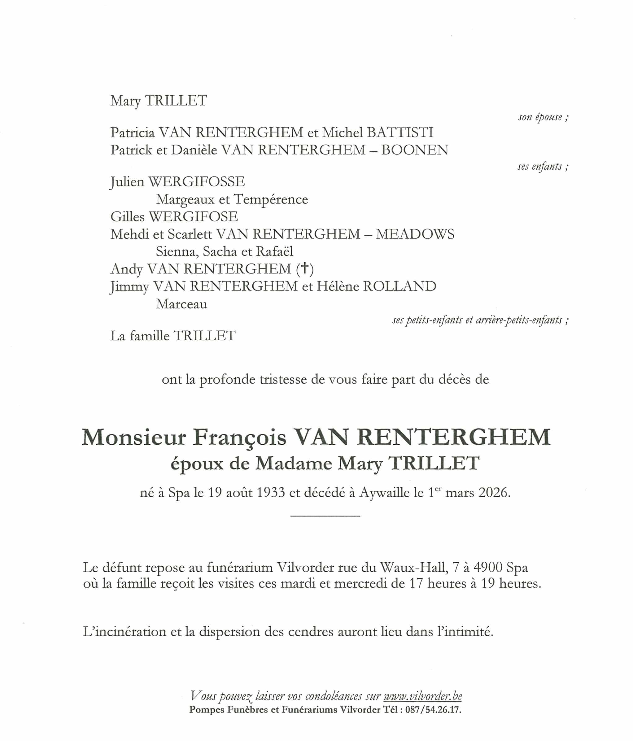 Domicilié(e) à Aywaille Né(e) le 19/08/1933 à Spa Décédé(e) le 01/03/2026 à Aywaille
