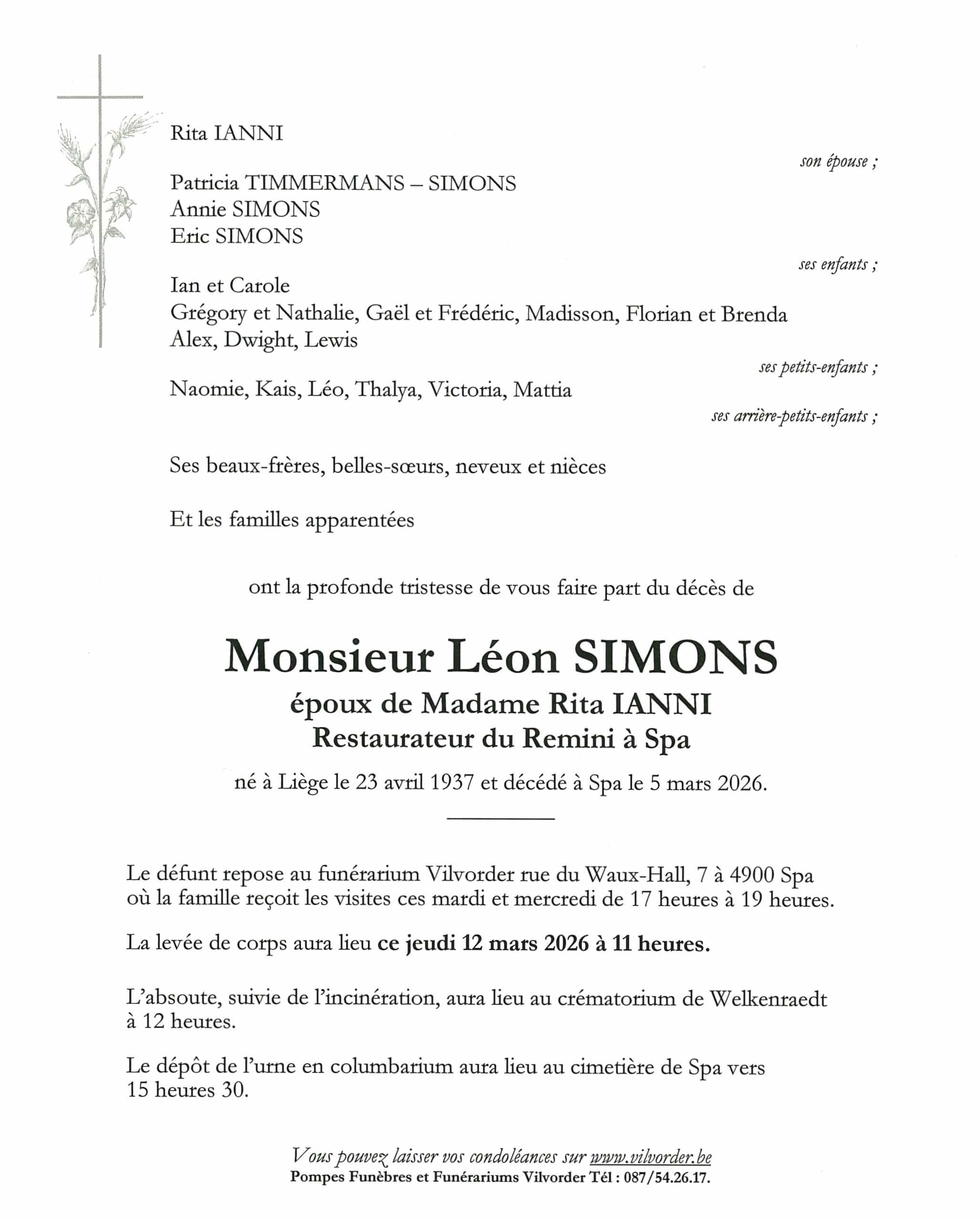 Domicilié(e) à Spa Né(e) le 23/04/1937 à Liège Décédé(e) le 05/03/2026 à Spa