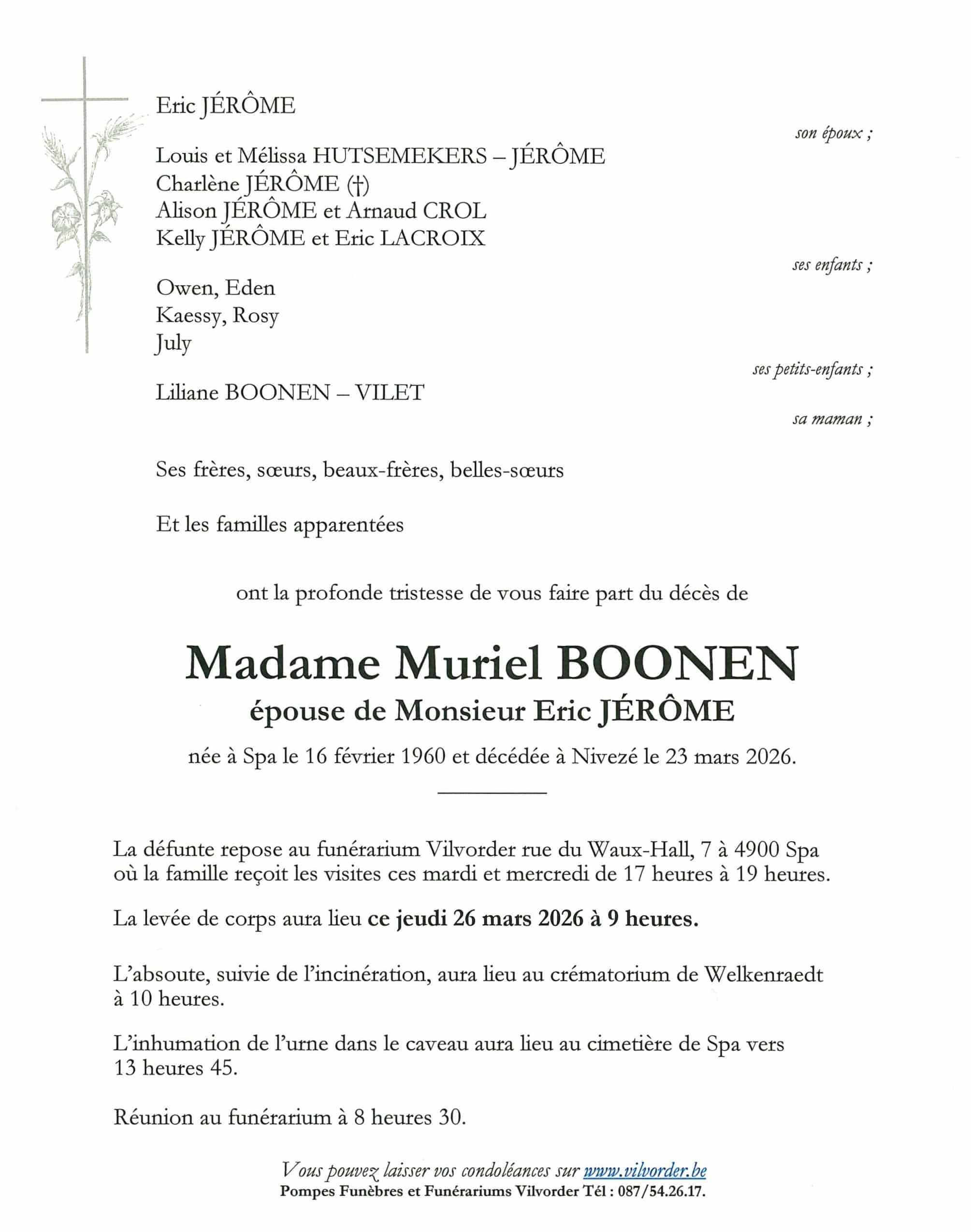 Domicilié(e) à Jalhay Né(e) le 16/02/1960 à Spa Décédé(e) le 23/03/2026 à Jalhay