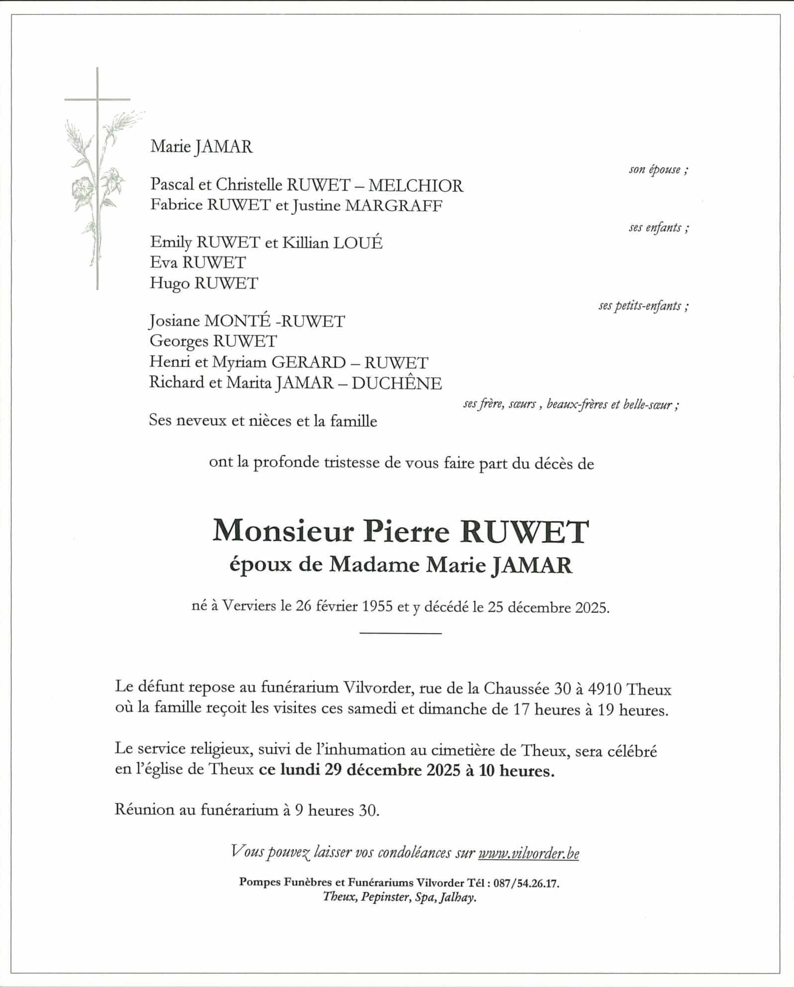 Domicilié(e) à Juslenville Né(e) le 26/02/1955 à Verviers Décédé(e) le 25/12/2025 à Verviers