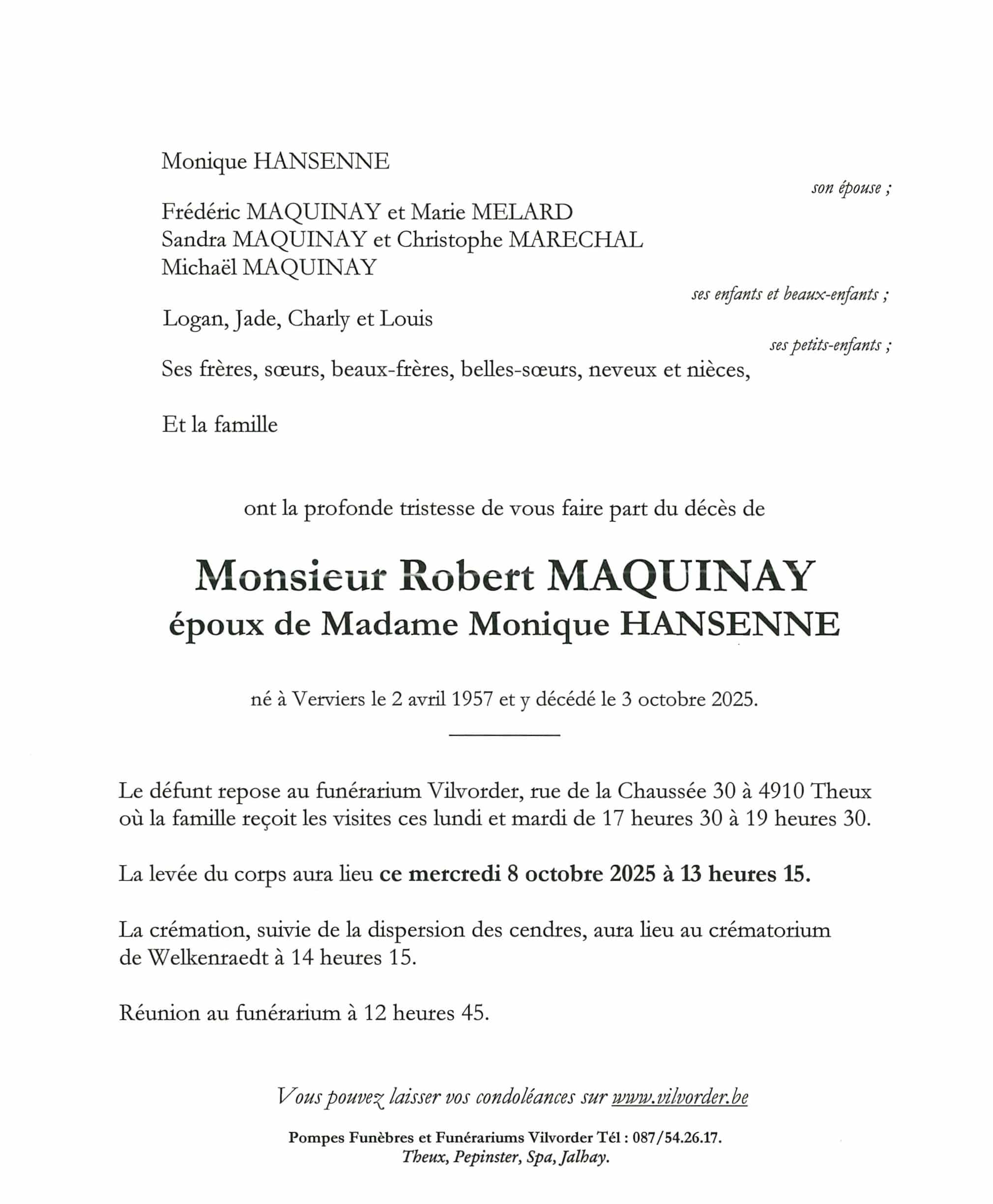 Domicilié(e) à Theux Né(e) le 2/04/1957 à Verviers Décédé(e) le 3/10/2025 à Verviers
