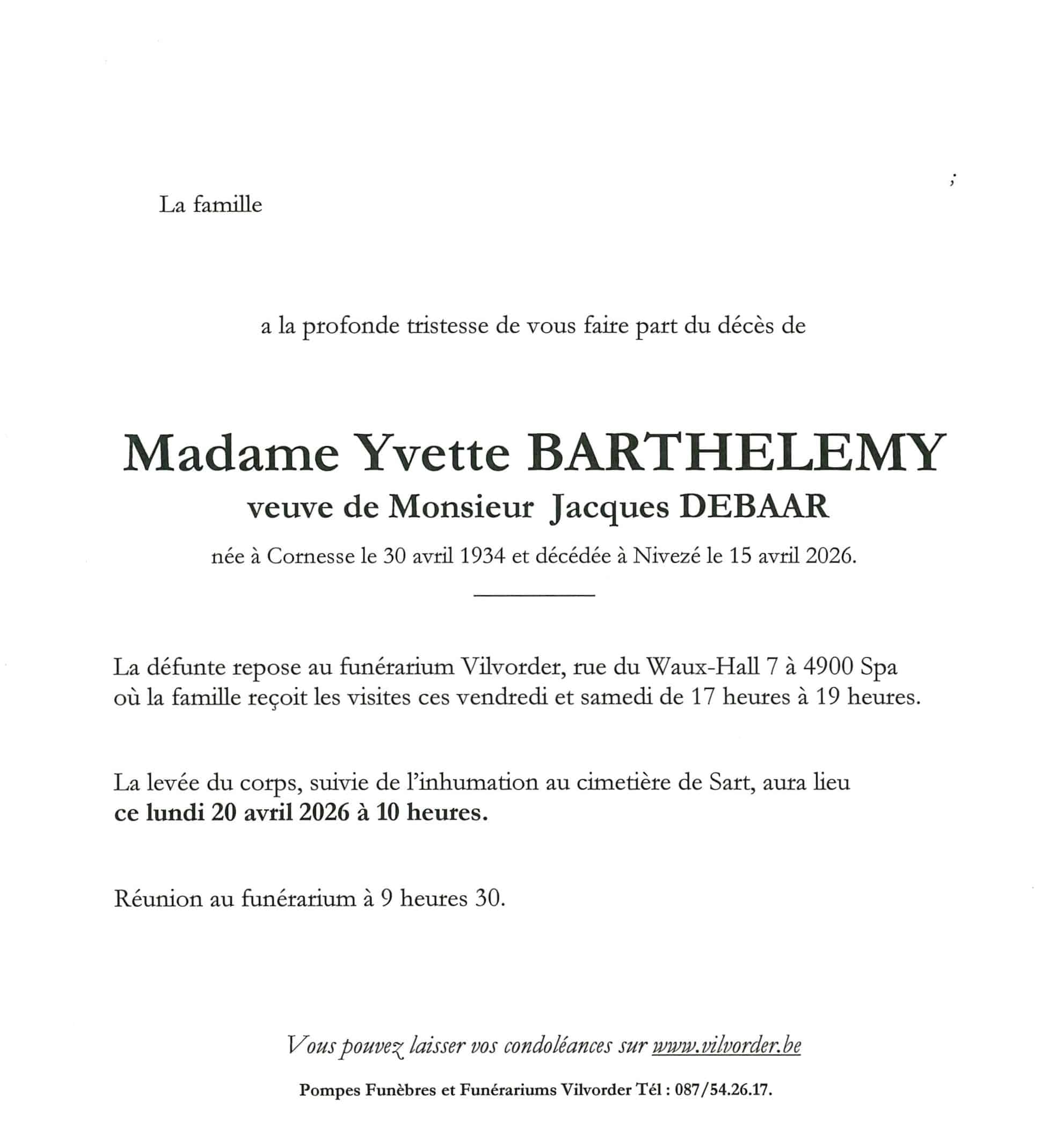 Domicilié(e) à Nivezé Né(e) le 30/04/1934 à Cornesse Décédé(e) le 15/04/2026 à Nivezé